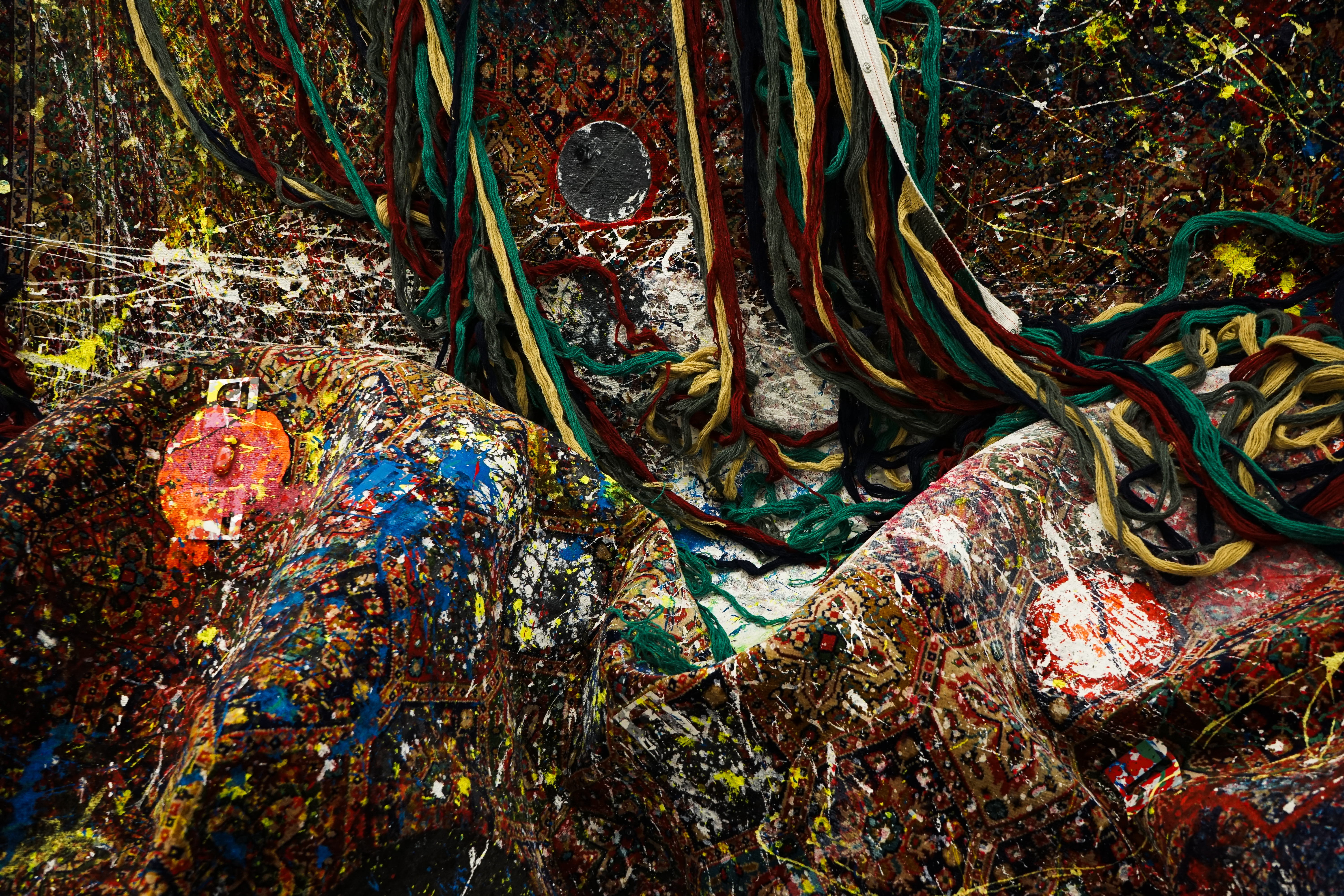 Highlighted Work: Woven Threads of TimeWoven Threads of Time is a series that uses Persian rugs as canvases. This artistic choice is deeply rooted in Ibrahim's childhood experiences growing up in a Muslim family, where prayer mats and rugs were ever-present symbols of ritual, grounding, and cultural heritage.